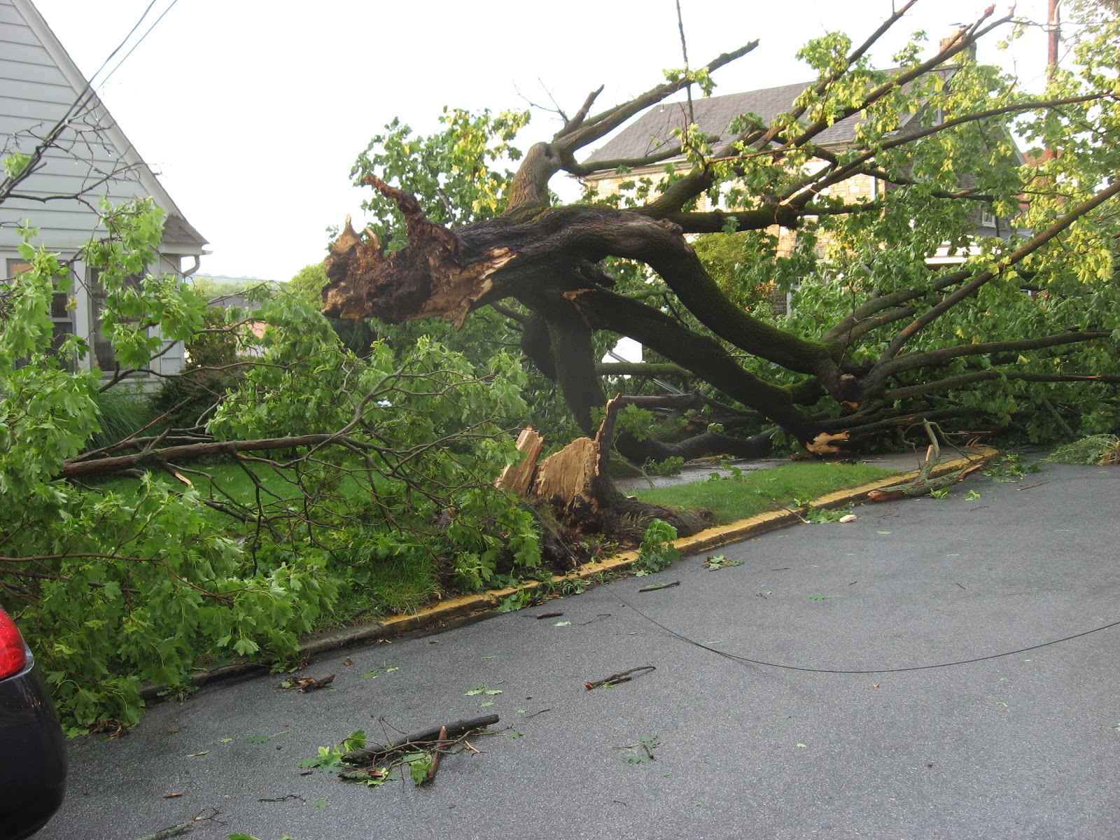 I secured the window locks and ventured a peek outside my front door. A huge limb from the maple in my neighbor's year had been ripped from the trunk and was now covering most of his front lawn and some of his front porch roof. I felt relieved that it had done no structural damage to his house...and I was glad the limb had not crushed my Ford Taurus, which was parked on the other side of the tree.